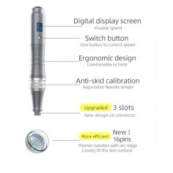 The Dr pen M8 micro needling device is one of the most popular Dr pen devices as it features a digital display, 6 speeds, depth adjustment range of 0.25-3.00 and the new 3 slot connector. The M8 can also we used wirelessly if required.